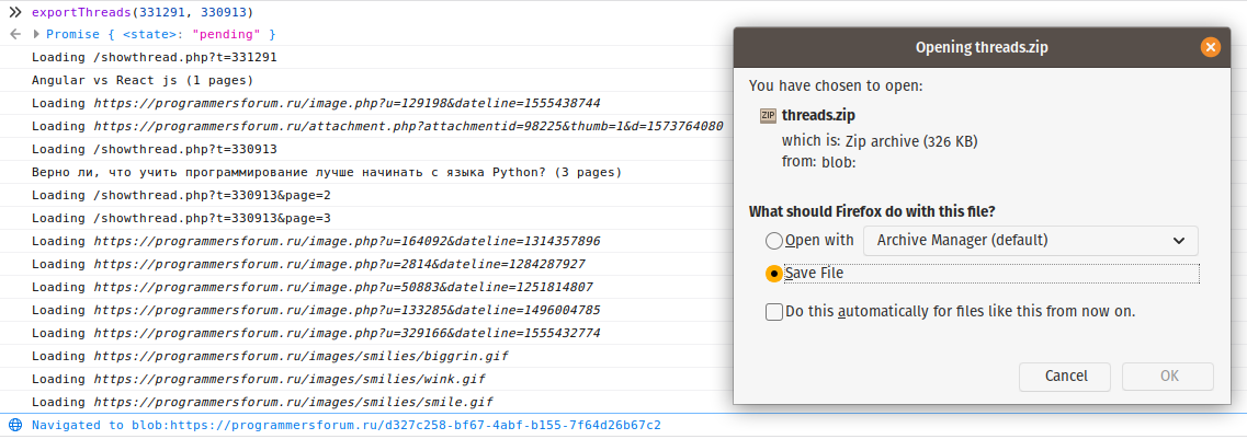 Adds a function that exports the specified threads (with all attachments, avatars, smiles, poll results) to HTML files that can be opened locally/offline.