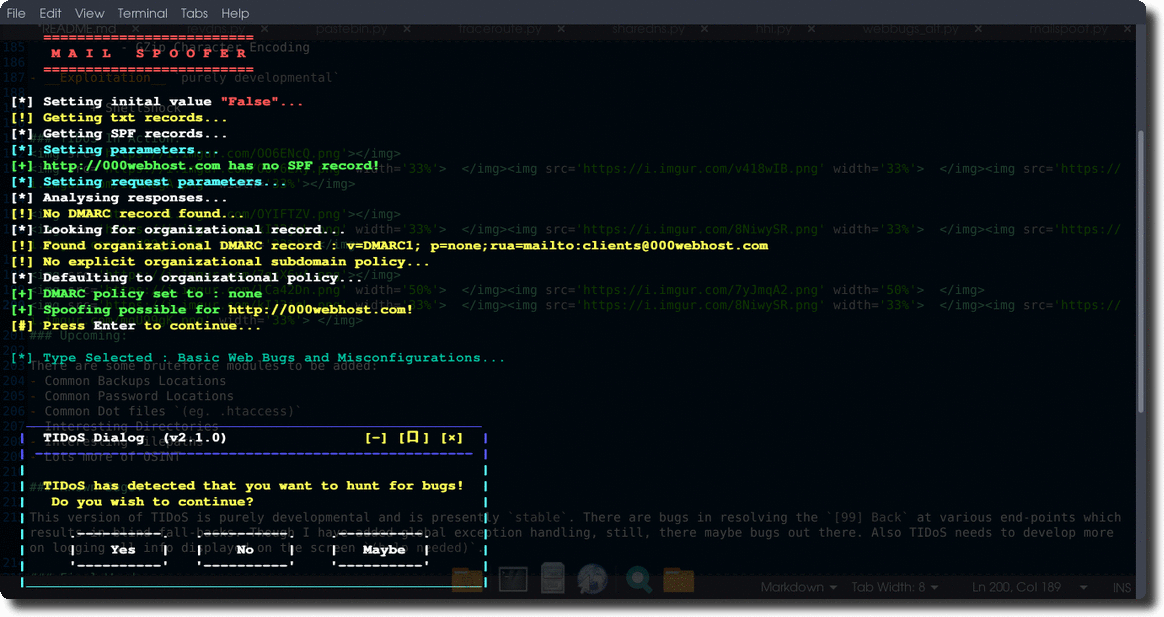 TIDoS is an in progress work far from perfection and I admit that there may be bugs out there which may cause many modules not to work properly and just bug out. However, being the only single author and maintainer behind this framework, it is my humble request to all users of this framework to hand me the list of modules via raising a new issue which simply do not work and bug out, and I would be more than happy to fix them as we jointly make our journey to realising TIDoS as the greatest web penetration testing framework ever built.