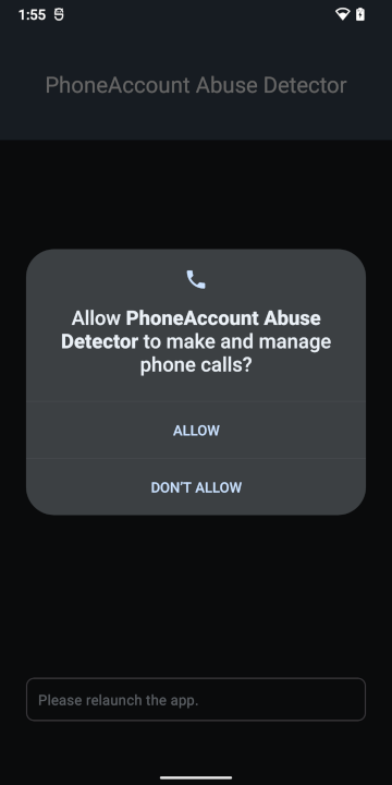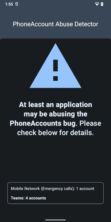 Simple application to enumerate and detect any application that (ab)uses adding an indefinite amount of PhoneAccount(s) to Android's TelecomManager. As seen on Android Police, XDA-Developers, Xataka Android, Ars Technica.