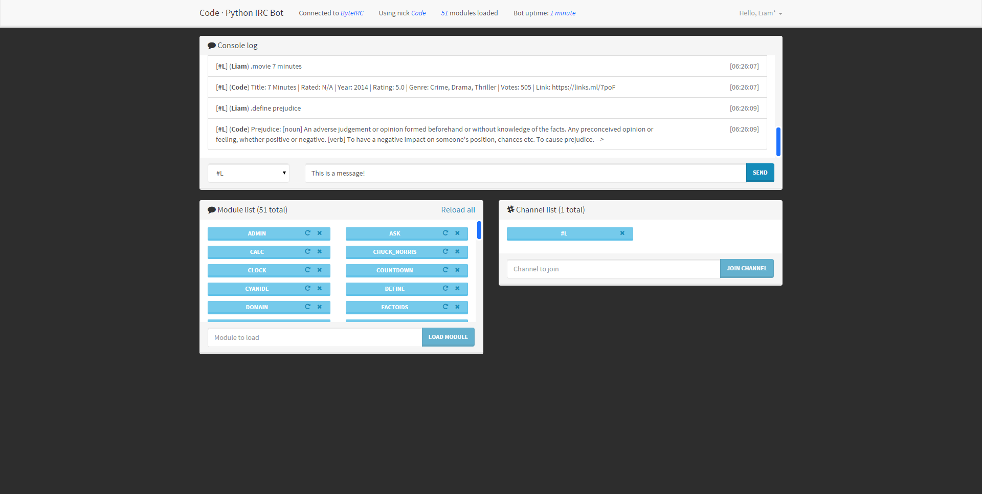 Code is a open source python IRC bot. Code can run on any operating system that supports Python 2.7, but works best on Linux based distributions.