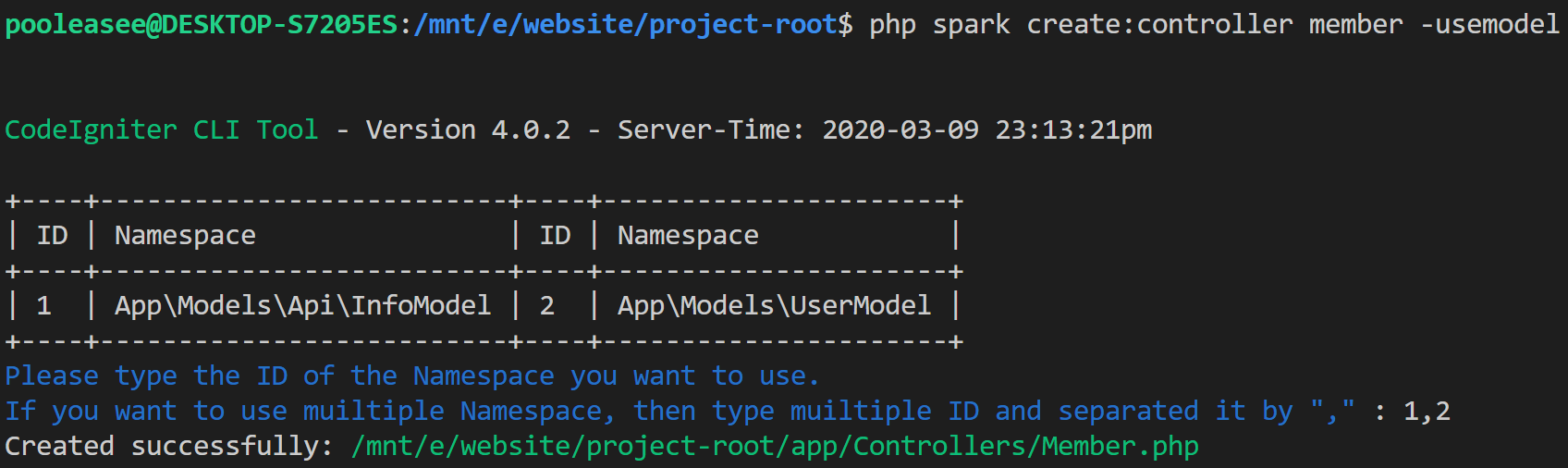 php spark create:controller -space [controller_name] -model=basic,space [model_name]