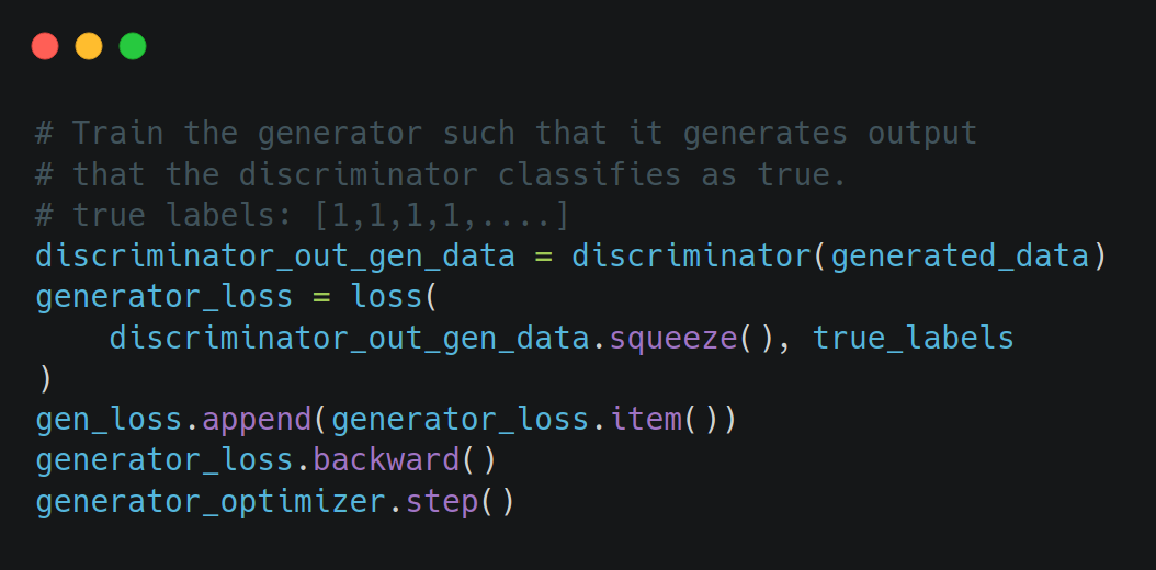 Gen_Loss = loss(Dis_result_for_Gen_output, True Label)Gen_loss.backward()