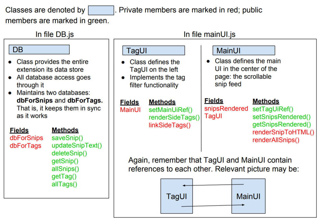 The /mainUI folder comprises the main UI of the extension -- the one seen here. mainUI.html and mainUI.css again define the layout and styling of the page, as you may expect. mainUI.js is the second substantial part of the extension's codebase. This is what renders all the snips into the page, and keeps the tags up to date on the side, whilst also adding in the tag filter functionality. This file defines two classes, MainUI and TagUI, which are used to implement this functionality. The MainUI class defines the scrollable snip feed in the center of the page. The TagUI class defines the tags on the left. These classes are (regrettably) coupled together; i.e., each class holds a reference to the other. I believe this is necessary though, because changes in the TagUI need to affect the MainUI, and changes in the MainUI need to affect the TagUI.