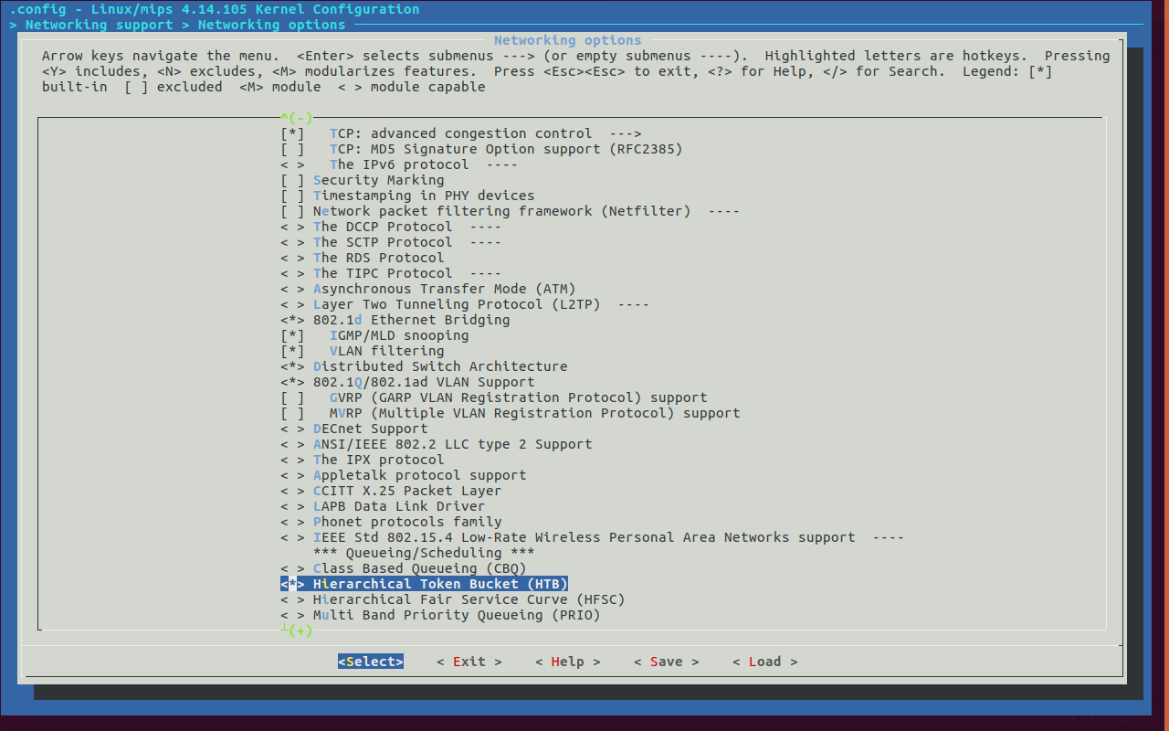 Quando concluir o processo aparecerá outro menu. Vá para Networking support -> Networking options e inclua a opção Hierarchical Token Bucket (HTB):