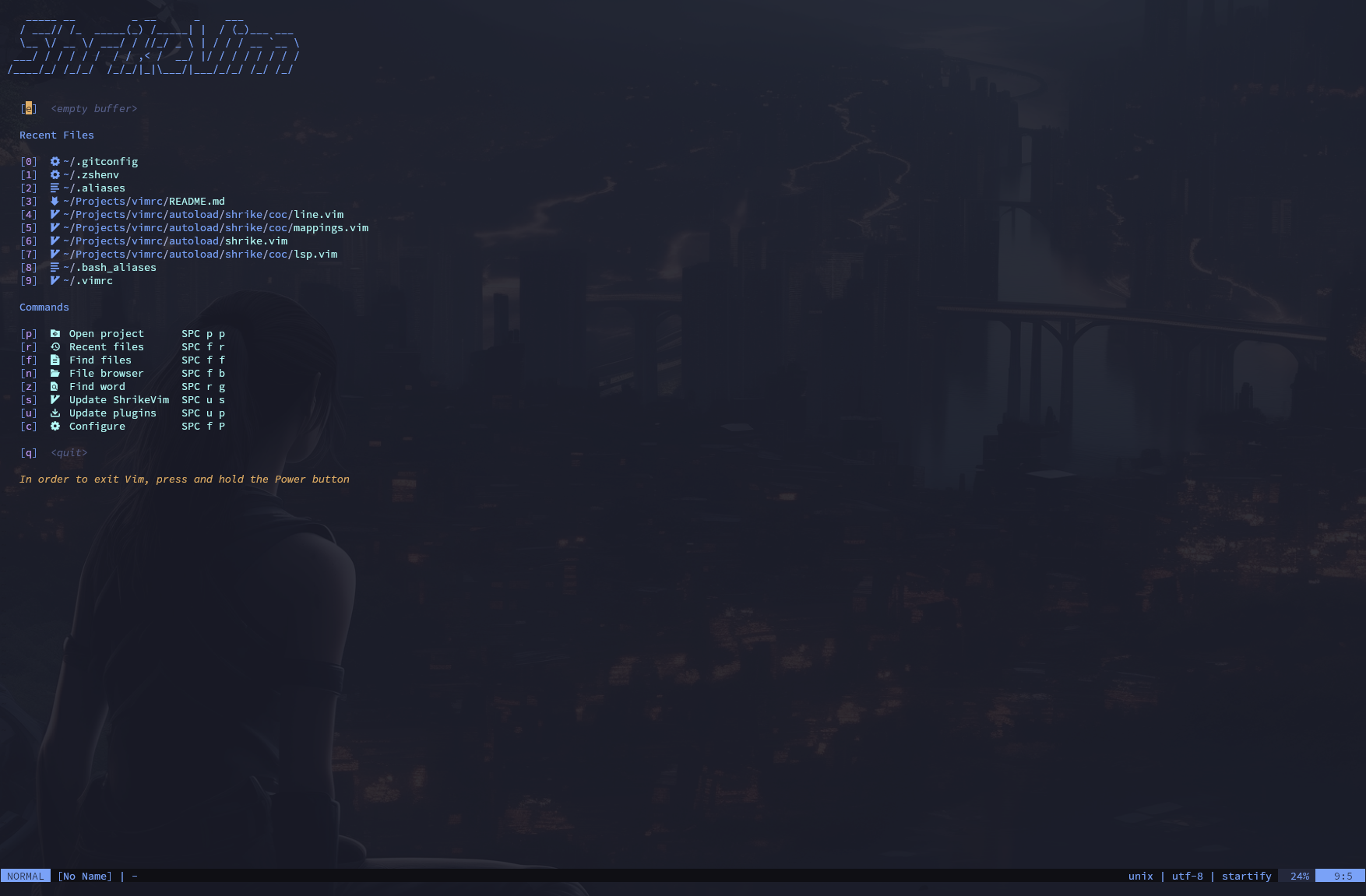 ShrikeVim comes with sane (or maybe opinionated?) defaults and utilities to make your vimrc as small and readable as possible.